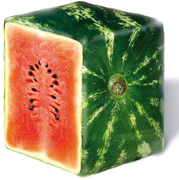 Японцам приписывают изобретение квадратных арбузов. Идею подхватили в Панаме, Бразилии и Объединенных Арабских Эмиратах, откуда арбузы экспортируют в Европу и продают за баснословные деньги, что вообще-то нонсенс. Ведь арбузы квадратной формы не только легко перевозятся, но и эффективно заполняют торговые площади, что ведет к снижению транспортных и иных расходов и в результате понижает розничную цену. Одни ученые-агрономы основывают свои опыты на достижениях генетики. Другие просто помещают молодые арбузы под квадратный стеклянный колпак или в колбу. В процессе роста в этом «прокрустовом ложе» круглый арбуз деформируется в куб или другие, порой фантастические формы. Так, студенты японской сельскохозяйственной школы Atsumi Agricultural High School изобрели и запатентовали кубические арбузы, которые назвали Kaku-Melo. Они появились в продаже в Японии летом 2007 года. Многие детали технологии запатентованы и засекречены. Но принцип тот же — пластиковый шаблон.